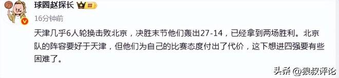 媒体人“球圈赵探长”发文点评:天津几乎6人轮换击败北京,决胜末节他们轰出27-14,已经拿到两场胜利。北京队的阵容要好于天津,但他们为自己的比赛态度付出了代价,这下想进四强要有些困难了。