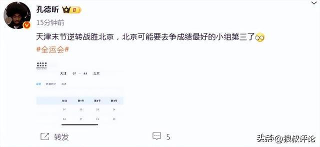 媒体人“孔德昕”发文点评:“天津末节逆转战胜北京,北京可能要去争成绩最好的小组第三了”。
