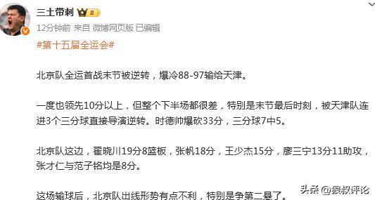 篮球记者“贾磊”发文点评:北京队在全运会首场比赛中被天津队上演大逆转。北京队一度取得了两位数的领先优势,但第四节摆出的“死亡五小”阵容让天津队成功实现了翻盘。天津队本场比赛只用了6人轮换,时德帅砍下33分,三分球7中5。
